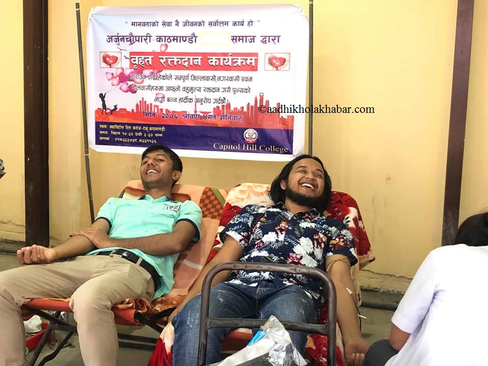 काठमाडौंको क्यापिटल हिल कलेज टेकुमा भएको रक्तदान कार्यक्रममा रक्तदाताहरूलाई प्रमाणपत्र तथा सहयोगीहरूलाई मायाको चिनो प्रदान गरिएको थियो । अर्जुनचौपारी काठमाडौं समाज स्याङजाको अर्जुनचौपारी स्थायी घर भई काठमाडौंमा बसोबास गरिरहेकाहरुको समाज हो ।
