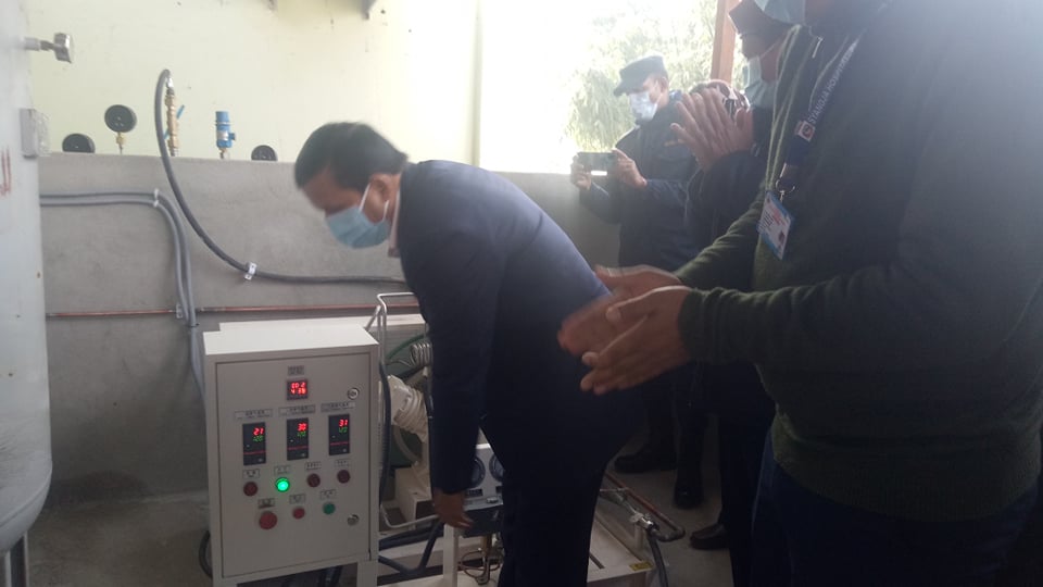 प्रमुख जिल्ला अधिकारी राजुप्रसाद पौडेलले अक्सिजन प्लान्ट को आजदेखि सुरुवात भएको जानकारी गराउनु भषृ । मेशिन स्विच अन गर्दे प्रजिअ पौडेलले भन्नुभयो ‘अक्सिजनका लागि जिल्लाले अव अन्त भर पर्नु पर्ने छैंन । बिजुलीका लागि नयाँ ट्रान्सफर्मर सहित अक्सिजन प्लान्ट संचालनमा आएको हो । जिल्लाबासीका लागि खुशीका कुरा हुन यी ।’