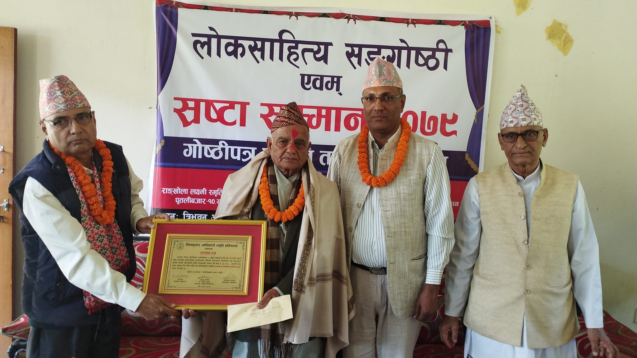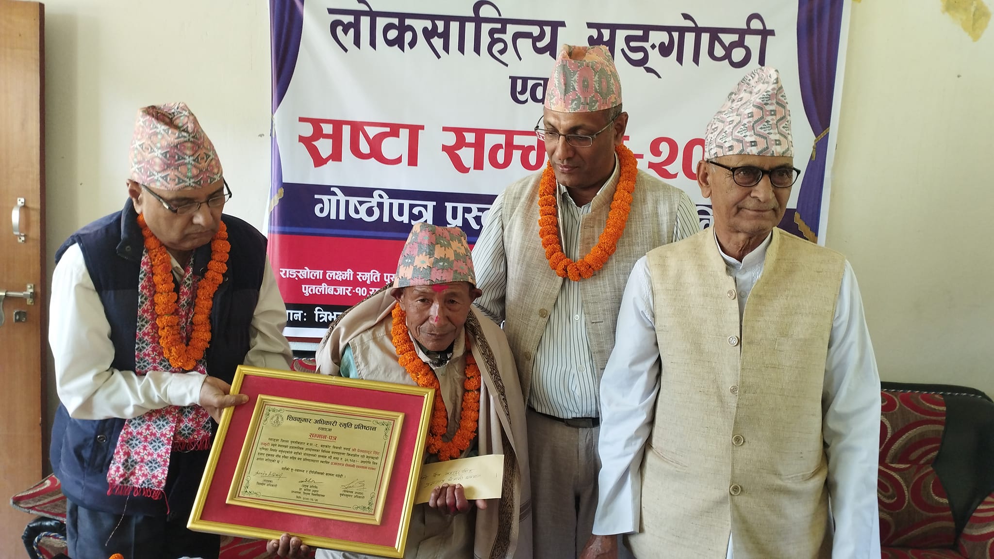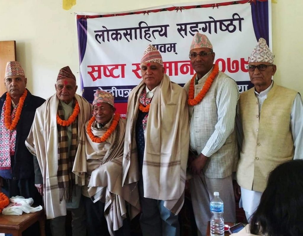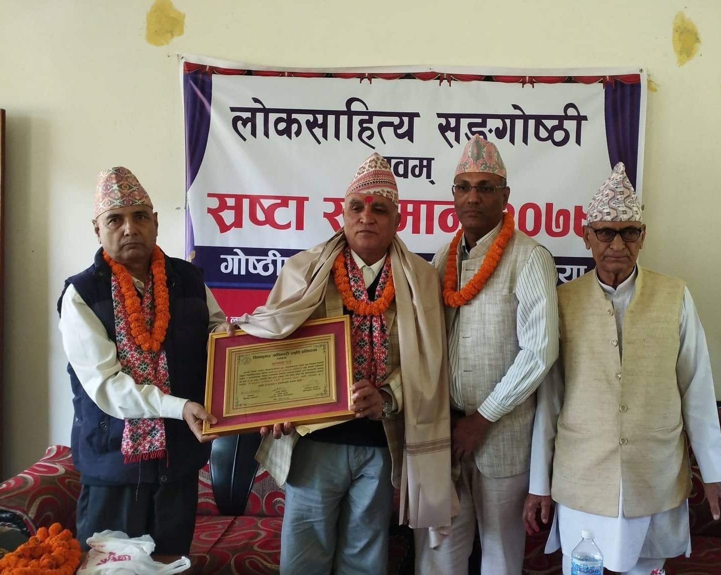 स्याङ्जा साहित्य प्रतिष्ठान, राङ्खोला लक्ष्मी स्मृति पुस्तकालय तथा शिवकुमार अधिकारी स्मृति प्रतिष्ठानद्धारा आयोजित लोकसाहित्य सङगोष्ठी एवं स्रष्टा सम्मान कार्यक्रममा उनीहरुलाई सम्मान गरिएको हो।