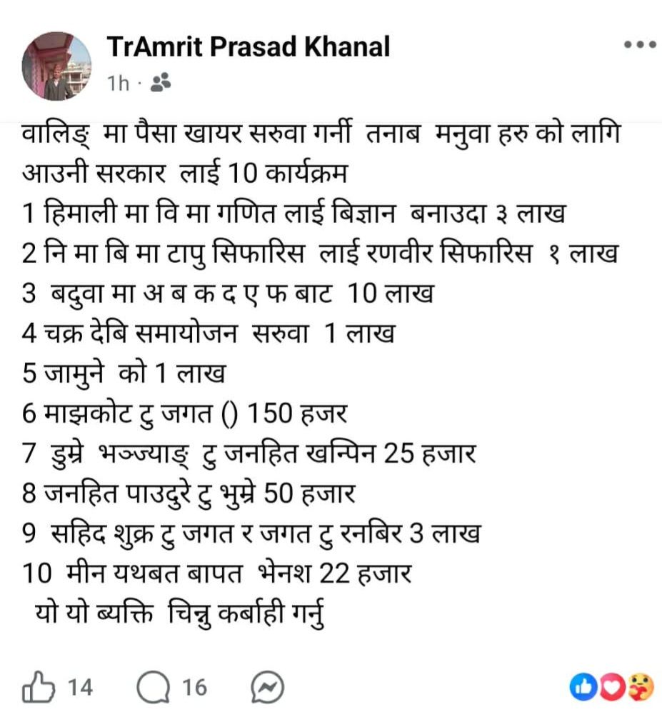 मुलुकमा नयाँ सरकार गठन प्रक्रिया अगाडि बढीरहेका बेला शिक्षक खनालले आगामी सरकारलाई १० कार्यक्रम भन्दै पैसाको चलखेल गरेको घुमाउरो पारामा उल्लेख गरेका छन् । उनले उल्लेख गरेको पोष्टलाई कसरी प्रमाणित गर्ने छन् भन्ने बिषयले पनि तरङ्गित बनाएको छ । दरबन्दी फेरबदल, शिक्षक सरुवा र बढुवामा शिक्षकले रकम खर्च गर्नुपरेको बताएका छन् । कुन विद्यालयबाट कहाँ शिक्षक पठाउँदा कति रकम खर्च गर्नुपरेको समेत उल्लेख गरेका छन् ।